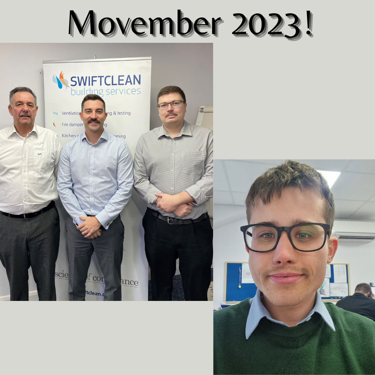 Some of the Swiftclean team decided to support Movember this year – the leading charity changing the face of men’s health. Well done to Matt, Martin, Sam, and Vinney for persevering and raising money for such a great cause.